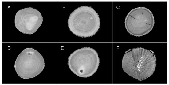 CT scans of oak sections with examples showing their internal features. (A) displays healthy knots in an oak, (B) shows the distinction between sapwood and heartwood, (C) highlights cracks in an oak, (D) reveals rot in an oak, (E) depicts an unhealthy knot, (F) illustrates the presence of metal in the oak.