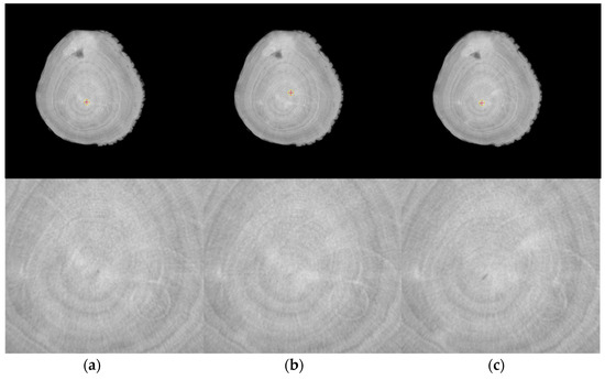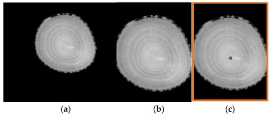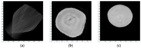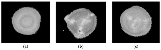 Oak logs selected for neural network evaluation—(a) a healthy tree, (b) a tree with many defects, and (c) a tree with a large diameter, on the scan of which we can observe a significant artifact.