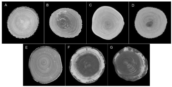 CT images of different types of trees ((A)—oak, (B)—aspen, (C)—beech, (D)—linden, (E)—ash, (F)—spruce, (G)—pine).