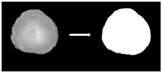 In our case, the region containing the scanned object is first delineated by binarizing the image based on the selected threshold (Figure 6). Then, the coordinates of the center of gravity are calculated using Equations (1) and (2). For this calculation, f(x,y) = 1, where x and y are the coordinates of the white pixel in the image, and f(x,y) = 0 otherwise.
