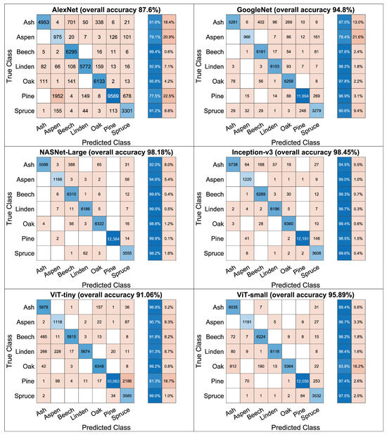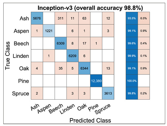 In the first step, six selected neural networks are trained and tested for classification purposes. A total of 42,258 slices are used for the evaluation. These slices are selected from logs entirely different from those in the training database to better assess potential issues with overfitting in the network. Figure 9 presents the results of the classification accuracy of wood species from CT images for the six different neural networks.