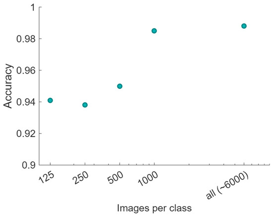 Prediction accuracy depending on the number of images used in individual classes of the training dataset.