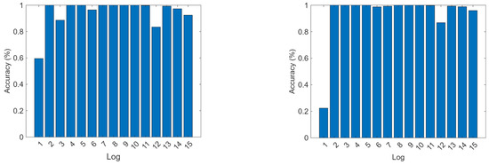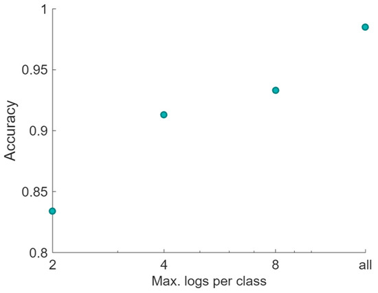 Another important aspect of constructing the training database is determining the number of logs that will be used during training. Increasing this number enhances the variability of the images, reducing the likelihood that the network will encounter logs in real-world applications that differ significantly from those it has seen during training. Figure 12 illustrates the increase in success as the number of logs used to select images for the training database gradually increases. In the aspen class, the maximum of four available logs is always utilized. When all the logs are included, the number of logs from which the images are randomly selected remains balanced. Notably, narrowing the selection to images from only eight logs has a discernible negative impact on the prediction accuracy. A network trained with the maximum number of logs achieves an accuracy close to 100%. Furthermore, increasing the size of the training database may yield a slight improvement in the prediction accuracy.