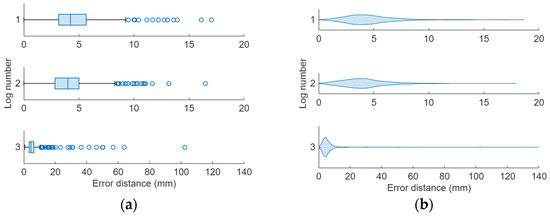Distribution of the deviations divided by individual logs and represented by box plot (a) and violin plot (b). The distribution of the deviation values is similar, but for log no. 3, “difficult” to analyze are images with a very large deviation.