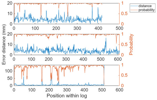 Graphs of the magnitude of the detected deviation of the estimate of the pith position and the probability assigned to the given estimate concerning the position in the log (3 pcs.).