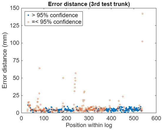 In Figure 16, we observe that the largest deviations occur at pith positions identified with the least certainty. This trend is particularly evident in log no. 3, which shows the most significant deviations due to its challenging nature. This pattern becomes even more pronounced in Figure 17, where we highlight the selected threshold (95%) to distinguish between less certain deviations (red) and those more likely to be accurate (blue). Notably, estimates with a probability greater than 95% exhibit deviations significantly smaller than 20 mm.