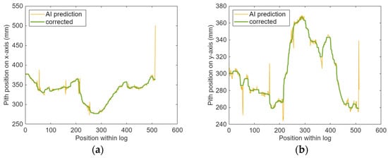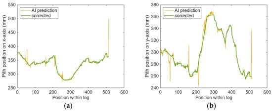 This comparison illustrates the x-coordinates (a) and y-coordinates (b) of the pith in log no. 3, as generated by the neural network and the improved algorithm. The trajectory is smoother, exhibiting fewer abrupt jumps, and aligns more closely with the expected position of the pith.
