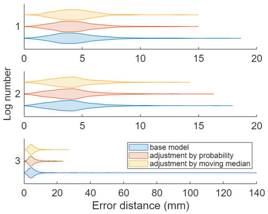 In Figure 21, we observe that the modified models not only show a more realistic movement of the pith within the log but also reduce the occurrence of extreme deviations. Although the error distribution remains similar, it is important to note that the median smoothing is independent of the prediction probabilities and the availability of images with “trustworthy” estimates for interpolation. In this respect, median smoothing proves to be a more robust method compared to probability-based smoothing.