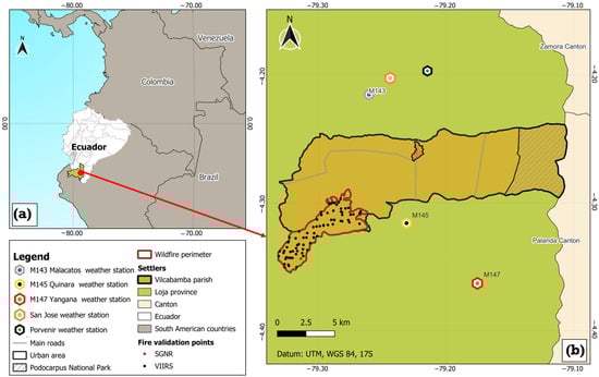 Location of the study zone: (a) Representation on a macro-scale (Ecuador); (b) Vilcabamba parish including the delineation of the wildfire perimeter analysed, weather stations, and the wildfires recorded in the year 2019 (pre-fire scene) by the SNGRE and VIIRS.