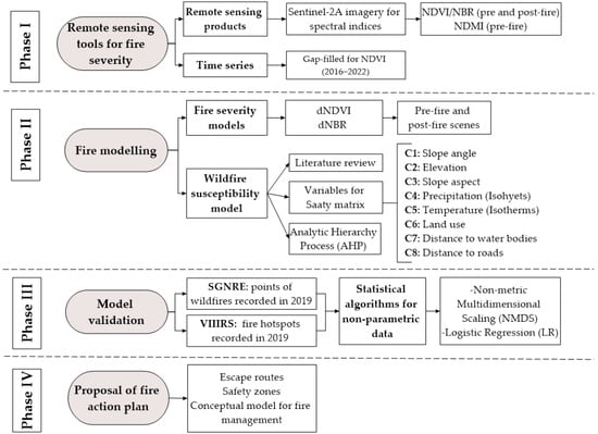 The methodological approach includes four phases as shown in Figure 2: First, remote sensing methods (spectral indices for fire severity analysis) and geoprocessing tools (i.e., Geographic Information System (GIS) and GEE). Second, fire severity models using differentiated indices (dNDVI and dNBR) and a fire susceptibility model using the Analytic Hierarchy Process (AHP) method that considers variables such as slope angle, elevation, slope aspect, isohyets, isotherms, land use, distance to water bodies, and distance to roads. Third, the validation process for fire severity models and the fire susceptibility model. Fourth, the proposal of an action plan for fire management. This action plan includes the establishment of refuge areas, escape routes, and a conceptual model that evidences the fire triggers in the sector as a tool for decision-makers (governmental bodies and the community).
