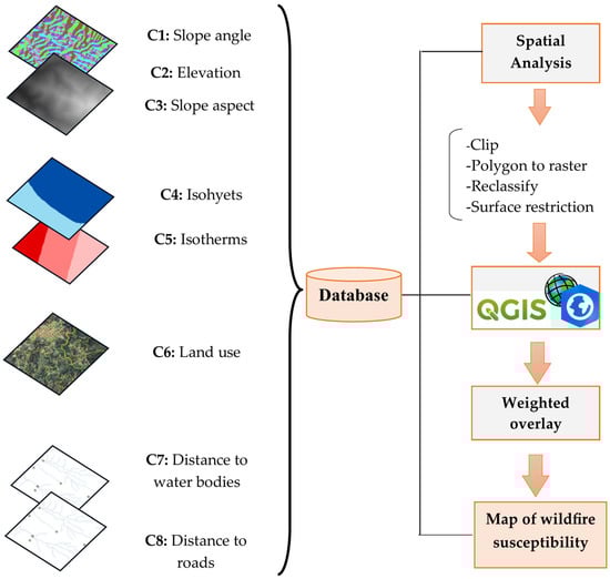 Predicting forest fires is challenging because these events could have natural or anthropic origins. Therefore, we selected eight variables (C1 to C8) that better represent fire susceptibility in Vilcabamba parish as a guideline for decision-makers. The variables are the most significant triggers in the study area according to the literature review and analysis of the baseline data in the study area.