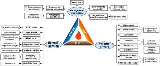 Remote sensing tools are widely used to understand wildfire dynamics. However, these techniques present some limitations due to weather conditions associated with cloud cover, which are challenges with observations on terrestrial surfaces [18]. However, multi-temporal analysis and machine learning based on remote sensing and statistical analysis (i.e., Logistic Regression, Multivariate Adaptive Regression Spline, Random Forest) facilitates the understanding of spatial, social dynamics and the temporality of fire events on the land surface [19]. The time series data of spectral indices could be inconvenienced due to cloudiness, aerosols, sun, ozone, and dust [20]. In this way, the application of the Cloud-gap-filled (CGF) method through Google Earth Engine (GEE) allows for efficient cloud removal, especially in Andean regions with high cloud cover [21].