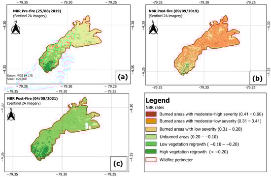 NBR index in fire perimeter with Sentinel-2A imagery: (a) Pre-fire scene (9 September 2019); (b) Post-fire scene (9 September 2019); and (c) Post-fire scene (4 August 2021).