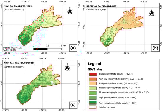 NDVI results of fire perimeter: (a) Pre-fire scene (25 August 2019); (b) Post-fire scene (9 September 2019); and (c) Post-fire scene (4 August 2021).
