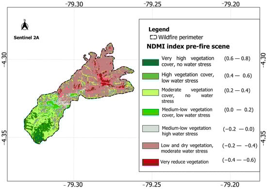 Figure 7 shows the NDMI calculated in the fire perimeter with Sentinel-2A imagery in the pre-fire scene (dry season) because most fires are generated from June to September in this region. The NDMI is a pillar for fire severity analysis because it presents the moisture and water stress conditions of the fire perimeter zone, giving us evident patterns of the state of the vegetation in the pre-fire scene. The NDMI ranges were adapted based on a literature review in Andean areas with conditions similar to those of the study area, such as the Colombian Andes [74]. NDMI values from −0.2 to −0.4 correspond to low and dry vegetation and represent 52.62% of the fire perimeter. Meanwhile, in the southwest zone of the wildfire perimeter, 8.27% has high vegetation cover with low water stress.