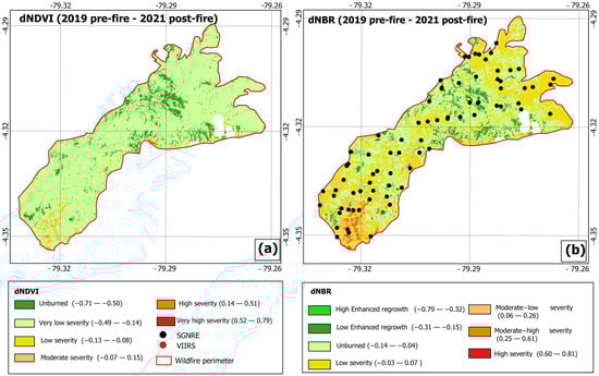 The dNDVI and dNBR models computed with Sentinel-2A images consider observations of pre-fire (2019) and post-fire (2021) scenes within six categories of fire severity. We selected the severity categories with the support of a literature review [75,76]. Figure 7 shows that the high severity values from the dNDVI and dNBR were very similar despite these indices using different spectral bands and fire severity categories for their calculation. These models allow the assessment of damage severity and vegetation regeneration between the pre-fire (2019) and post-fire (2021) periods. In Figure 8a, unburned areas represent 10.11% of the total fire perimeter extent, while areas of very low severity represent 85.77%. This analysis suggests that most affected areas show low severity, although some areas show high and very high severity, indicating a significant impact of the fire in certain parts. In Figure 8b, the dNBR index highlights vegetation recovery in the post-fire phase. Areas with high and low enhanced regeneration are shown in shades of green, indicating positive progress in recovery, while affected areas with low to high severity are represented in colours ranging from yellow to red. The validation points in both models corroborate the presence of areas of enhanced recovery in the north, although recovery is heterogeneous around the fire perimeter.