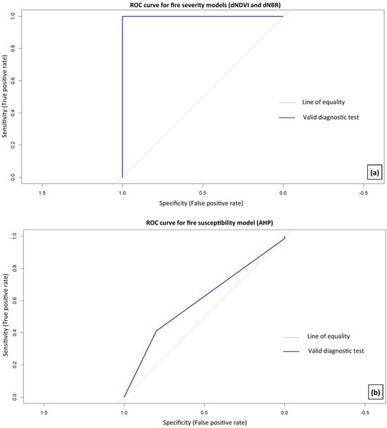 We validated the fire severity models (dNDVI and dNBR) and the fire susceptibility model with 78 points of registered fires in the year 2019. This information was distributed as follows: 77 points of fire hotspots were collected from the Active Fire Product of Suomi NPP Visible Infrared Imaging Radiometer Suite (VIIRS) and 1 point from the SNGRE. These data have a binary value of 0 and 1, where 0 represents the absence of fires, and 1 the presence of these fire events in the pre-fire scene (year 2019). In Table 6, we present the exploratory analysis of the data before selecting the model validation algorithms, verifying the non-normality of the data as the kurtosis exceeds the range between −3 and +3.