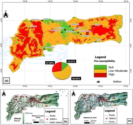 - Arias, P.; Cabrera, S.; Jácome, G.; Arias-Muñoz, P.; Cabrera-García, S.; Jácome-Aguirre, G. A Multicriteria Geographic Information System Analysis of Wildfire Susceptibility in the Andean Region: A Case Study in Ibarra, Ecuador. Fire 2024, 7, 81. [Google Scholar] [CrossRef]