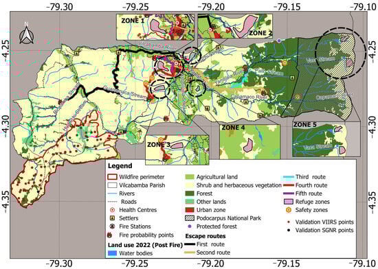 We selected the fire event of 3 September 2019, which occurred southwest of the parish, and it is considered the most representative background of fire dynamics in the region. By including the entire parish in this study, we can establish escape routes, considering the proximity to health centres, water bodies, fire stations, and fires that occurred in the sector in the last decade. Human activities provoked the fire of 3 September 2019, and it is recognised as the most representative in this region because it spread across 1837.64 ha and was extinguished in three days by firefighters [28]. Additionally, the Podocarpus National Park is located northeast of Vilcabamba parish, which has been declared a protected area of Ecuador according to the Ministry of Environmental, Water and Ecological Transition in Ecuador (MAE, Spanish acronym), a biodiversity hotspot in southern Ecuador with more than 560 bird species recorded [29].