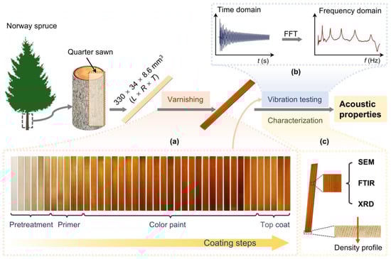 In this study, we traced the evolution of the acoustic vibration properties of spruce wood specimens throughout the entire surface coating process. Differences in acoustic vibration performance parameters between different coating treatments and the different step nodes were compared. The effects of these treatments on the acoustic vibration performance of the wood were explored by combining the methods of microscopic morphology, material characterization, and signal analysis. Moreover, the variations in acoustic vibration performance parameters were analyzed in terms of density, E, and damping. The main results are summarized as follows: