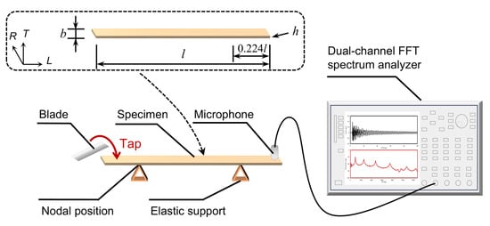 The transverse bending vibration method was employed under free boundary conditions at both ends, using a dual-channel fast Fourier transform (FFT) spectrum analyzer (CF-5220Z, Ono Sokki, Kanagawa, Japan) to measure the first five resonant frequencies of the experimental and control groups before and after different coating steps. In the FFT analyzer, a rectangular window was selected for the window function, the sampling frequency was 2.56 times the range (6400 Hz), the time of data acquisition was 0.125 s, and the number of samples was 2048. The sensitivity of the microphone (MI-1233, Ono Sokki, Kanagawa, Japan) was 316 mVr. The elastic triangular support was placed at a distance of 0.224 l from the ends of the specimen, and the blade was rotated. A blade was struck on the surface of one end of the wood specimen to generate vibration, and the sound signal generated by the vibration was received by the microphone placed at the other end and then passed through an amplifier, filter, and FFT analyzer for A/D data conversion, filtering, and Fourier transform to obtain the time domain and frequency spectra. (Figure 1b and Figure 2). Considering the aspect ratio (l/h > 20) [], the effects of shear and rotational inertia were neglected. The dynamic modulus of elasticity E is calculated using the Euler–Bernoulli beam vibration theory as follows: