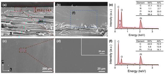 SEM images of the samples after final alcohol varnish coating: (a) cross-section at 200 times magnification (thickness shown as mean ± standard deviation); (b) cross-section at 1000 times magnification; (c) surface at 200 times magnification; (d) surface at 1000 times magnification. The inset in (d) shows the surface at 2000 times magnification. EDS spectra of wood cross-section (e) and varnish film cross-section (f). In figures (a) and (b), the blue dashed boxes correspond to the scanned regions of figures (e) and (f), respectively. L: longitudinal; R: radial; T: tangential.