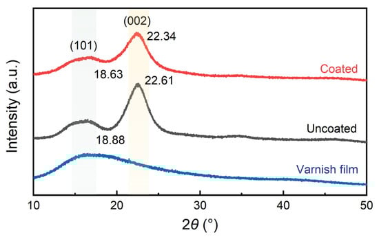 As shown in Figure 5, the diffraction peak of the uncoated sample (2θ = 22.61°) represents the diffraction intensity of the crystalline region of the wood, while the diffraction peak of the coated sample (2θ = 22.34°) has a significantly lower intensity, and the crystallinity of the coated sample (57.53%) decreased by 19.03% compared to the relative crystallinity of the uncoated sample (71.05%), which is related to the varnish film (shellac) on the surface of the coated specimen. However, the X-ray diffraction spectrum of the varnish film shows a diffuse halo with no obvious sharp diffraction peaks, indicating that it is an amorphous material, which is consistent with the literature results [,]. In the vibration process, the amorphous nature of the varnish film makes the internal molecular friction and the friction at the interface between the varnish film and the wood increase, and the vibrational energy loss increases, which reduces the energy used for acoustic radiation, resulting in a lower energy conversion efficiency of acoustic vibration.