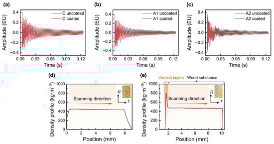 The time-domain plots (Figure 6a–c) clearly show the process from the beginning of vibration to a negative exponential decay until disappearance after the groups of specimens were subjected to transient excitation. After all coating steps, the signal vibration attenuation of the final specimen is accelerated. The tanδ is used to characterize the vibration energy loss due to the internal friction quantitatively; the tanδ of the uncoated specimen is 0.0072, while the tanδ values of the specimen after single- and double-sided coatings are 0.0089 and 0.0097, respectively, indicating that more energy is consumed by internal friction in the double-side-coated specimen compared to the single-side-coated specimen. This is because the varnish film has a tanδ of 0.1–0.25 (at 25 °C) [] and a density greater than that of wood (Figure 6d,e), and the presence of the varnish film causes an increase in the tanδ of the specimens, similar to the literature results [,].