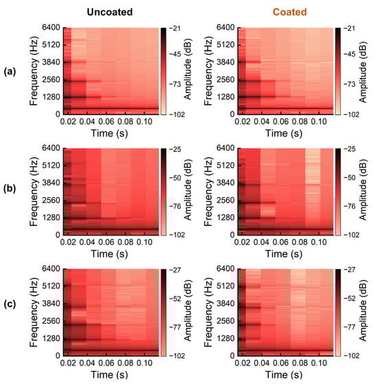 Most real signals are non-stationary and their spectral characteristics change over time. A single time-domain or frequency-domain analysis provides limited information when dealing with non-stationary signals []; therefore, to compare the changes of the first five-order frequency components of specimens with different coating treatments over time [], the time-domain signals were processed by using the short-time Fourier transform (with a window length of 512), and the time–frequency plots were obtained (Figure 7a–c). Within 0.015–0.115 s, the first-order vibration frequency of the specimens in different coating groups persisted, and the other order frequency components existed only at the early stage of vibration. Compared with the uncoated specimens, the duration of the second-order frequency of the single-sided coated specimen was about 21% shorter. The duration of the second-order frequency of the double-sided coated specimen was about 45% shorter, the duration of the third-order frequency was about 31%, and the shortening of the duration of the second- and third-order frequencies of the double-sided coated specimens was the most obvious. The increase of tanδ after surface coating implies a faster attenuation of the vibration signal, leading to a shorter duration of the vibration, which is not conducive to the fullness of the sound [], and may produce the so-called “dead sound” []; moreover, the double-sided coating deepens this negative effect.