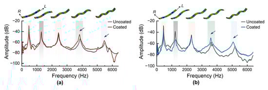 In particular, the frequency reduction was more significant for specimens coated on both sides. Furthermore, when the vibration order increased, the frequency decrease at the high-frequency zone became more significant while the low-frequency region did not experience a significant fall in frequency []. The shift in frequency to the low-frequency region means that the coated specimen is more likely to respond when subjected to external excitation []. At the same time, the lower the frequency, the lower the pitch, as evidenced by the experiences of violin luthiers and players, who observe that freshly varnished violins tend to sound duller compared to when they are not coated [,].