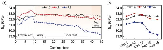 (a) The change in Esp in different coating treatments during the entire coating process; (b) Esp at different step nodes for various coating treatment groups. A1, A2, and C are the same as in Figure 6.