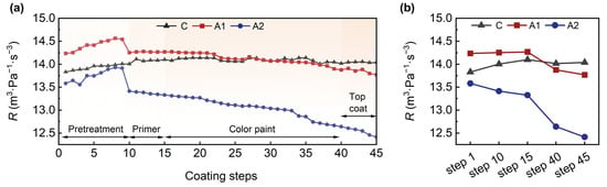 (a) The change in R throughout the entire coating process via different coating treatments; (b) R values of different coating groups at different step nodes. A1, A2, and C are the same as in Figure 6.
