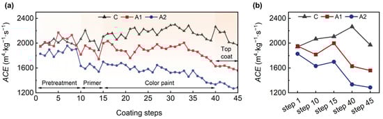 (a) The changes in ACE values throughout the entire coating process with different coating treatments; (b) ACE values of different coating groups at different step nodes. A1, A2, and C are the same as in Figure 6.