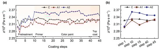Acoustic impedance is the resistance encountered by sound waves as they propagate from one medium to another []. The smaller the acoustic impedance, the better the acoustic vibration properties of the material []. As shown in Figure 12a, the z of group C did not change much throughout the coating process; the z of groups A1 and A2 rose during the pretreatment stage, and the change in the z value fluctuated but roughly leveled off during the subsequent coating steps. Overall, z tended to rise slightly throughout the coating process, and the magnitude of the z rise in group A2 was greater than that in group A1.