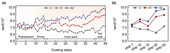 (a) The change in tanδ in different coating treatments during the entire coating process; (b) tanδ of different coating groups at different step nodes. A1, A2, and C are the same as in Figure 6.