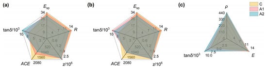 R is a parameter that characterizes the acoustic radiation capacity of wood and its products; the higher the R, the higher the resonance quality []. Moreover, the varnish film accumulated in layers on the surface of the wood will affect R. As shown in Figure 10a, the R of group C fluctuated slightly throughout the coating process, but the overall change was not significant, while the R values of single-sided (A1) and double-sided (A2) groups first increased and then decreased in the pretreatment stage. The increases in R were 1.92%, 2.23%, and 2.12% in group A1 compared to step 1 after coating with gelatine, golden ground A, and golden ground B, respectively. The increases in R were 2.23%, 2.54%, and 2.43% in group A2, respectively. However, in the subsequent steps, R showed a decreasing trend in general, and the magnitude of R decreasing in group A2 was larger than that in group A1. Additionally, the value of R is related to the dynamic moduli of elasticity and density, so the R of the specimens with different coating treatments showed a similar pattern of change as that of Esp.