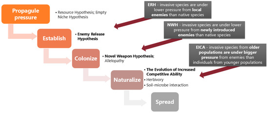 Salient hypothesis applicable at varying invasion stages (following Rai [21]). The graph highlights hypotheses in which plant pathogens play a crucial role.