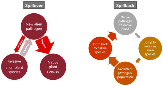 As suggested by Strauss et al. [7], the impact of spillover and spillback on native plants can be so significant that the pathogen may drive the invasion process, promoting the predominance of IAS over closely related native species, leading to disease-mediated invasions (DMI).