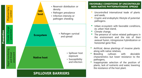 The barriers impacting the spillover mechanism at three following stages: invasive alien species host stage (yellow), ecosystem stage (turquoise), and native host stage (vivid green) (following Sokolow et al. [6]). Actions that can be used to prevent spillover at every stage of its spread are demonstrated on the left, favorable conditions that support transmission are on the right.