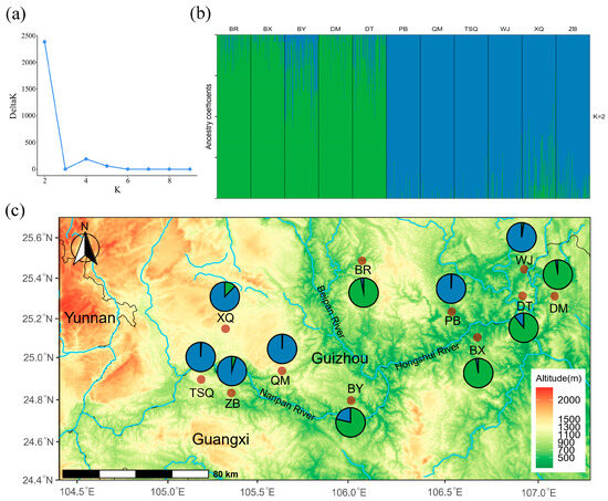 The STRUCTURE analysis revealed that the maximum value of Delta K appeared when K = 2 (Figure 1a). All individual seeds exhibited a low mixing ratio between the two genetic clusters. Cluster I (indicated in blue) comprised the populations XQ, QM, TSQ, ZB, PB, and WJ, while Cluster II (indicated in green) included DM, DT, BX, BY, and BR (Figure 1b). The distribution map indicates that Cluster I (blue) is predominantly represented by western and northern populations, whereas Cluster II (green) is primarily composed of eastern and southern populations. Notably, the BY population, located near the river confluence, exhibited a higher degree of genetic mixing compared to other populations. Populations on both sides of the river in the western group showed greater similarity in terms of co-ancestry, while the eastern group displayed significant genetic divergence (Figure 1c). UPGMA clustering, based on Nei’s genetic distances among populations (see Table S4), indicated that the optimal number of clusters was two (Figure S1). Cluster 1 included the populations PB, WJ, XQ, QM, TSQ, and ZB, while Cluster 2 comprised DM, DT, BX, BY, and BR. The compositions of these two clusters were consistent with the STRUCTURE results (K = 2).