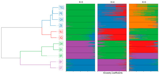 The clustering results were analyzed in conjunction with the STRUCTURE results for K values of 3, 4, and 5 (Figure 2). It is evident that the co-ancestry results align with the classification of the clustered subgroups. For K values of 3 and 4, the XQ, PB, TSQ, and QM populations in Cluster 1 exhibit a higher degree of individual mixing, while the clustering reveals closer genetic distances. In contrast, the populations in Cluster 2 demonstrate more pronounced co-ancestry differentiation, with the two clustered subgroups being genetically more distant. Notably, when K equals 5, the northernmost population, BR, stands out as an independent category, exhibiting significant differentiation between subgroups. This indicates that the populations in Cluster 1 are more closely related, suggesting a higher frequency of genetic exchange among them.