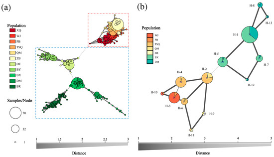 Haplotype network. (a) Haplotype network with a frequency greater than 1; (b) shared haplotype network of Pinus yunnanensis var. tenuiflolia based on cpSSR. Each node represents a haplotype, with the size of the node indicating haplotype frequency. The gray color and width of the connections are proportional to the genetic distance. The populations in Cluster 1 are enclosed in the red box, while the populations in Cluster 2 are enclosed in the blue box.