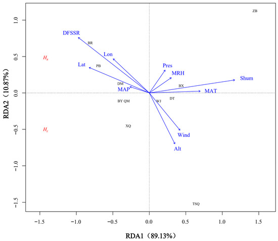Redundancy analysis ordination diagram illustrating genetic diversity and environmental factors. Rh, haplotypic richness; He, genetic diversity; LAT, latitude; LON, longitude; ALT, altitude; DFSSR, distance from sampling site to river; MAT, mean annual air temperature; MAP, annual precipitation; MRH, mean relative humidity; Shum, specific humidity; Wind, wind speed; Pres, atmospheric pressure.