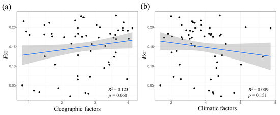 Regression analysis of genetic differentiation coefficients (FST) in relation to (a) geographic and (b) climatic factors.