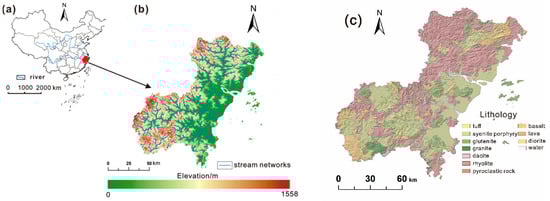 The location of the study area and the lithology map: (a) location of the study area in China, (b) the DEM map of the study area with stream networks, and (c) the lithology map of the study area.