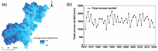The rainfall information of the study area: (a) the spatial distribution of average annual rainfall across the area, and (b) the annual rainfall during 1970 and 2020.