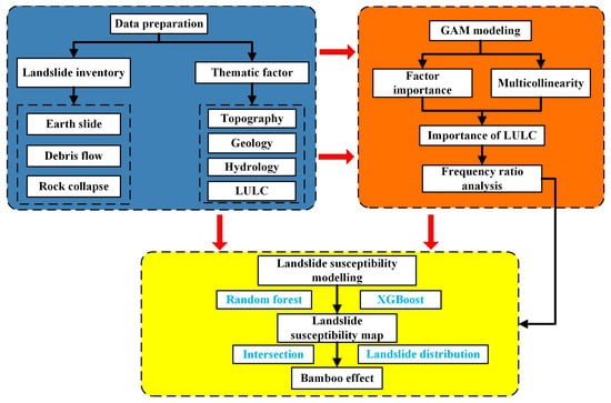 The main objective of this study is to reveal the impact of a specific LULC category, namely bamboo, on landslides at the regional scale. Wenzhou City in SE China, which suffers from rainstorm-triggered geohazards annually, is selected as the study area. We observed in the field that a large number of the hazards occurred within or near areas with bamboo. Hence, we aim to pose and address the following hypothesis: do the landslides in this region tend to occur in areas with dense distribution of bamboo? Specifically, our research aims include (i) determining the importance of LULC on landslides through multivariate nonlinear analysis of conditioning factors, (ii) conducting relationship analysis of bamboo and the spatial distribution of landslides and comparing this with other LULC types, and (iii) carrying out landslide susceptibility mapping based on machine learning models and performing correlation analysis between bamboo and landslide susceptibility levels.