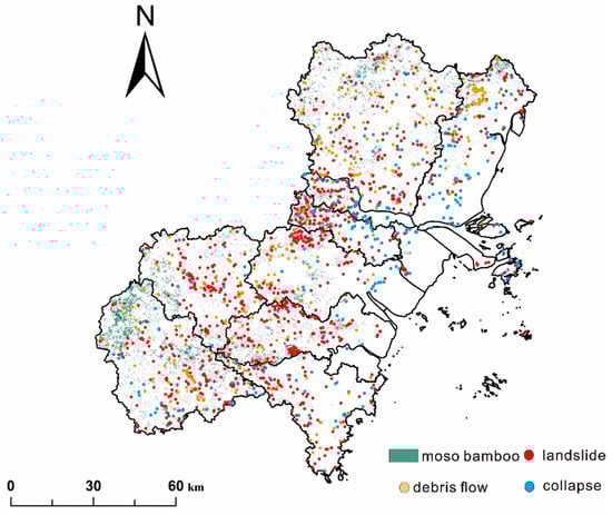 Over the past decades, it has been reported that many landslides have occurred in the study area [,], most of which have occurred in embankments or cut-slopes, as well as along roads, highways, and engineering structures in the hilly or mountainous regions. It should be mentioned that these landslides are mostly shallow in nature, occurring in the topsoil layers decomposed from parent bedrocks. It is crucial to implement accurate detection of these landslide locations and create detailed landslide inventory for regional landslide susceptibility analysis []. In this study, the landslide inventory of Wenzhou City is constructed from three main sources: (i) details of the historical landslides provided by local authorities, (ii) archived landslide survey reports that normally indicate detailed information, and (iii) on-site field surveys, which only cover some recent landslide cases. All these landslides are cross-checked to avoid repeated records of the same landslide. Subsequently, these landslides are imported into the GIS platform, together with their information, including administrative location, rough date, volume, etc. Given that deep-seated landslides seldom happen in the region, only shallow landslides occurring in the past 20 years were included in the inventory.