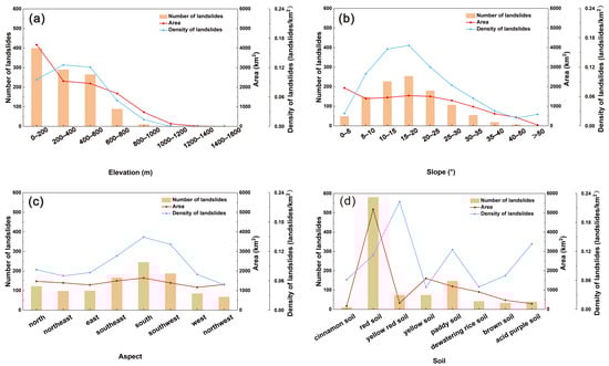 Next, the initiation points are analyzed to explore their relationship with some influencing factors of landslide occurrence, including elevation, slope, aspect, and soil (Figure 5). The analysis results show that landslides are distributed at elevations between 0 and 1200 m ASL, whereas the peak density is between 200 and 400 m ASL. It can be seen that most landslides occur in hilly areas rather than in the high mountains of Wenzhou City. The maximum number and density of landslides occurs at a slope angle of 15 and 20° at the initiation points, thus indicating that a moderate slope angle has a more negative effect on slope stability. These observations fit with the results from other test areas [], which confirm that the slope angle is not the sole factor affecting slope failure in high mountains. Regarding the aspect factor, the landslides facing S, SE, and SW have a larger number and density, whereas the other aspects are observed as relatively low. Finally, the effect of soil on landslide distribution reveals that the highest number of landslide points is located in red soil and paddy soil, whereas the peak density is associated with yellow-red soil. It should be noted that the soil map of Wenzhou City is obtained according to Chinese soil texture instead of the USDA soil taxonomy [].