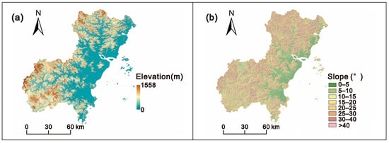 Wenzhou City in Zhejiang Province of SE China is selected as the study area. As reported in the previous literature [], this region often suffers from extreme-rainfall-induced landslides during the rainy season, especially due to typhoon events. The study area covers approximately 12,083 km2 and is a typical mountainous and hilly area (Figure 1). However, evident spatial differences in topography are observed, with higher elevations in the western part and lower elevations in the eastern part.